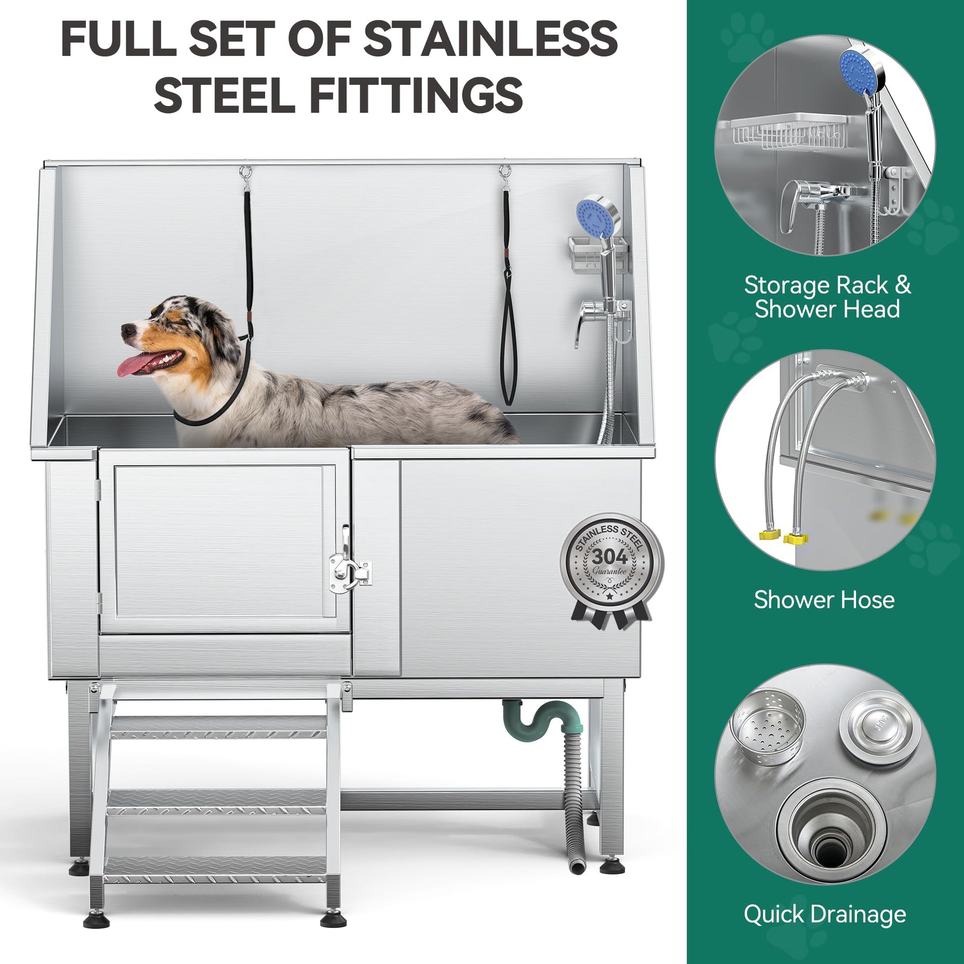 YITAHOME Dog Bathing Station, Professional Stainless Steel 304 Dog Grooming Bathtub w/Left Stairs, Faucet, Floor Grate, 50in Pet Washing Station for Large, Medium, Small Pets