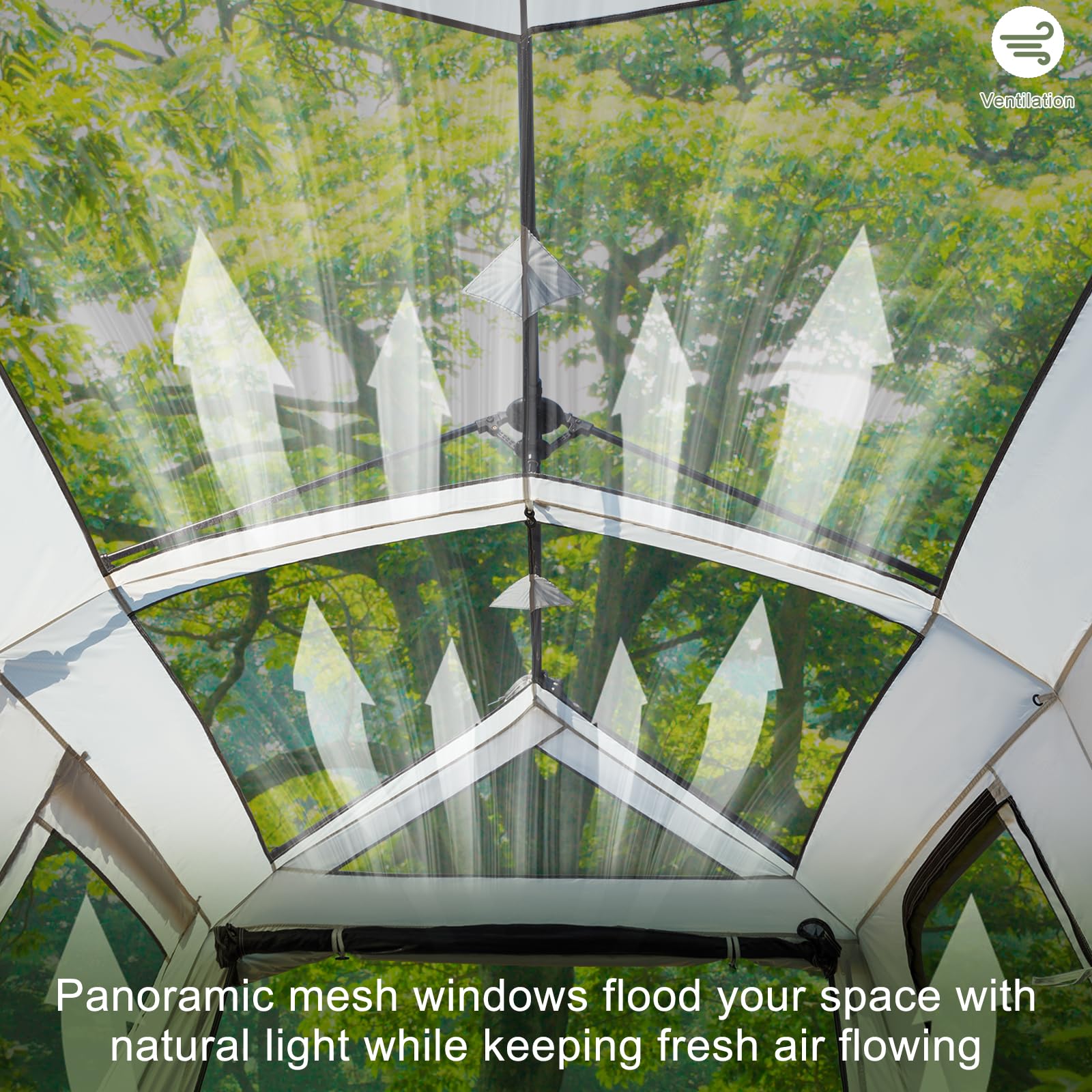 - 【Multifunctional Use】 Enjoy the generous 14' x 9' interior space with two mesh windows and four doors. The mesh ventilation windows on the top not only ensure air circulation but also enable you to enjoy the beautiful night sky