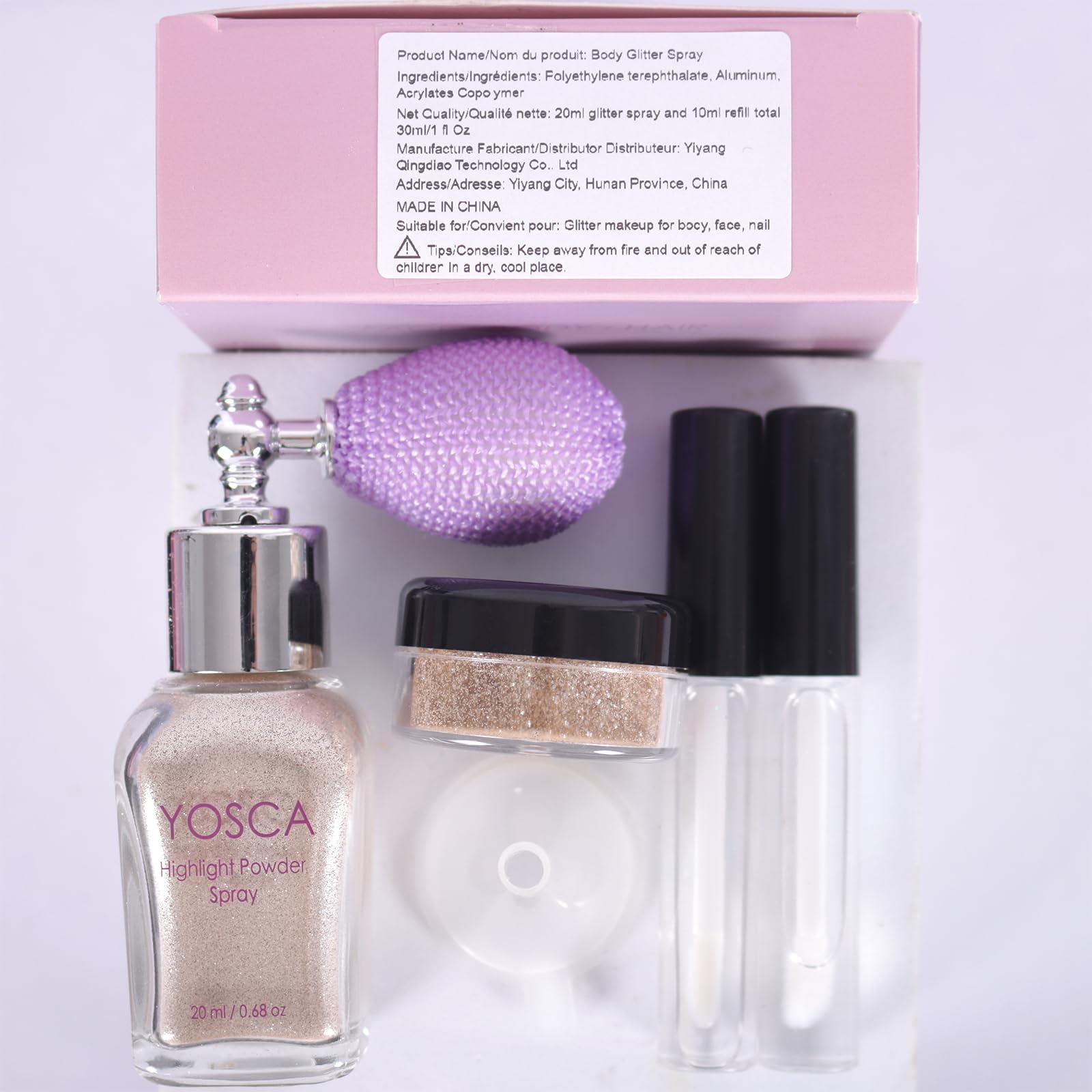 - Stunning Highlight Glitter: Yosca glitter spray is the way to infuse a touch of mesmerizing highlight sparkle into your style. Elevate your presence in any setting with its enchanting laser glitter effect. Our versatile spray body glitter is designed for all your highlight needs. Whether it’s for your hair, face, body, or outfit, our spray glitter will add that magical touch you desire.